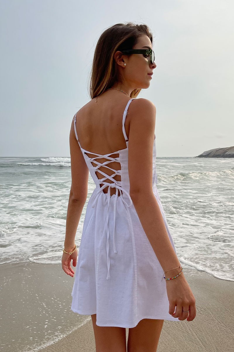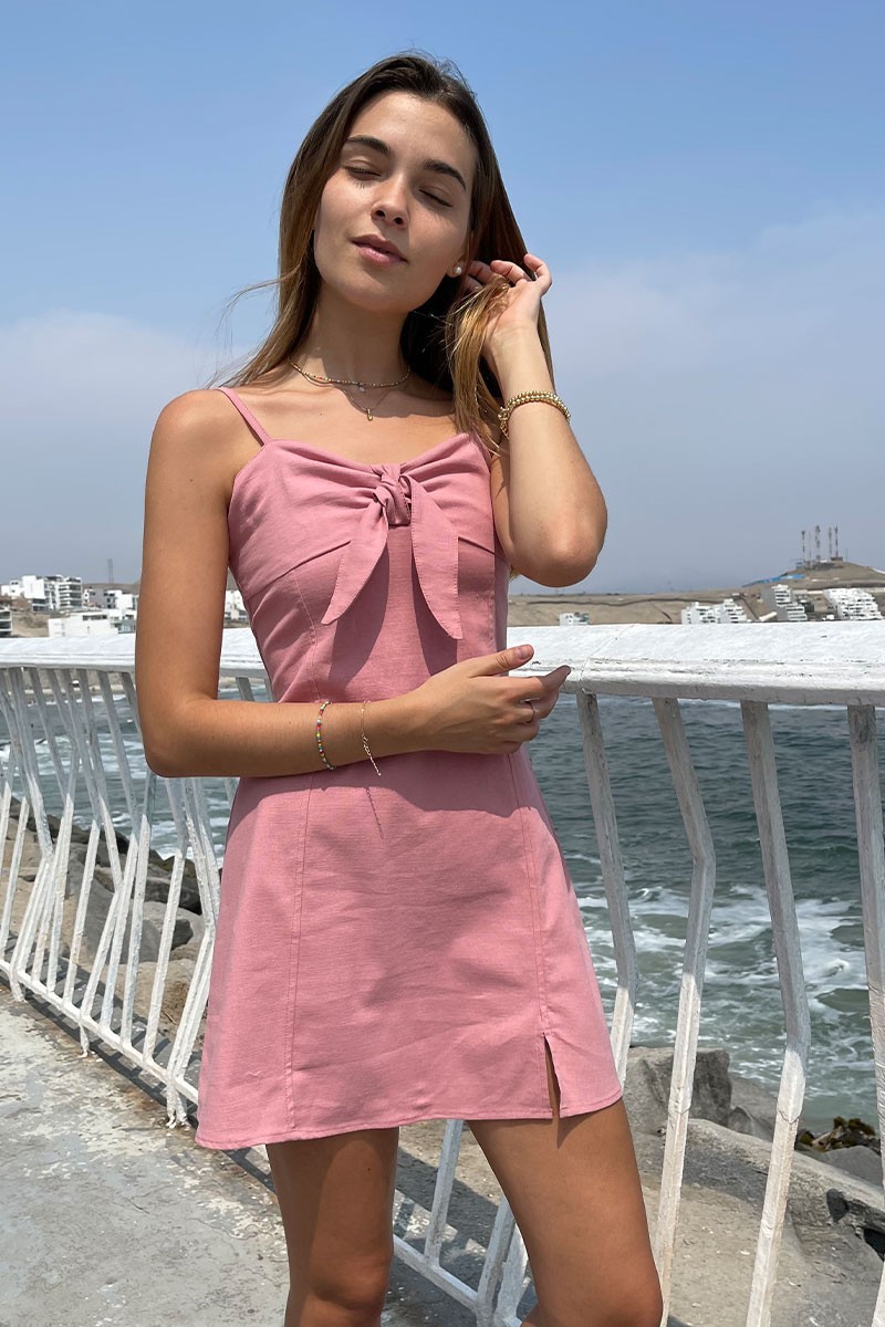 ¡Este vestido se volverá tu favorito! La espalda del vestido está diseñada con tiras ajustables que permiten regular el ajuste de la prenda a tu medida, brindando comodidad y una silueta personalizada. En la parte delantera, el vestido presenta un elegante moño frontal que agrega un toque de encanto y sofisticación al diseño . Diseño y producción 100% peruana. La modelo mide 1.73cm y usa talla S. Composición: 100% Algodón Cuidados: Lavado a mano No usar secadora Secado en sombra No usar lejia.