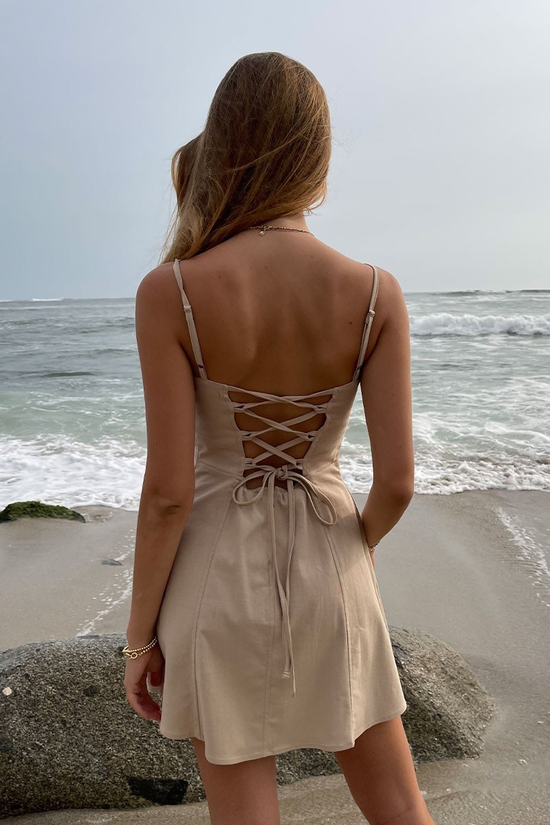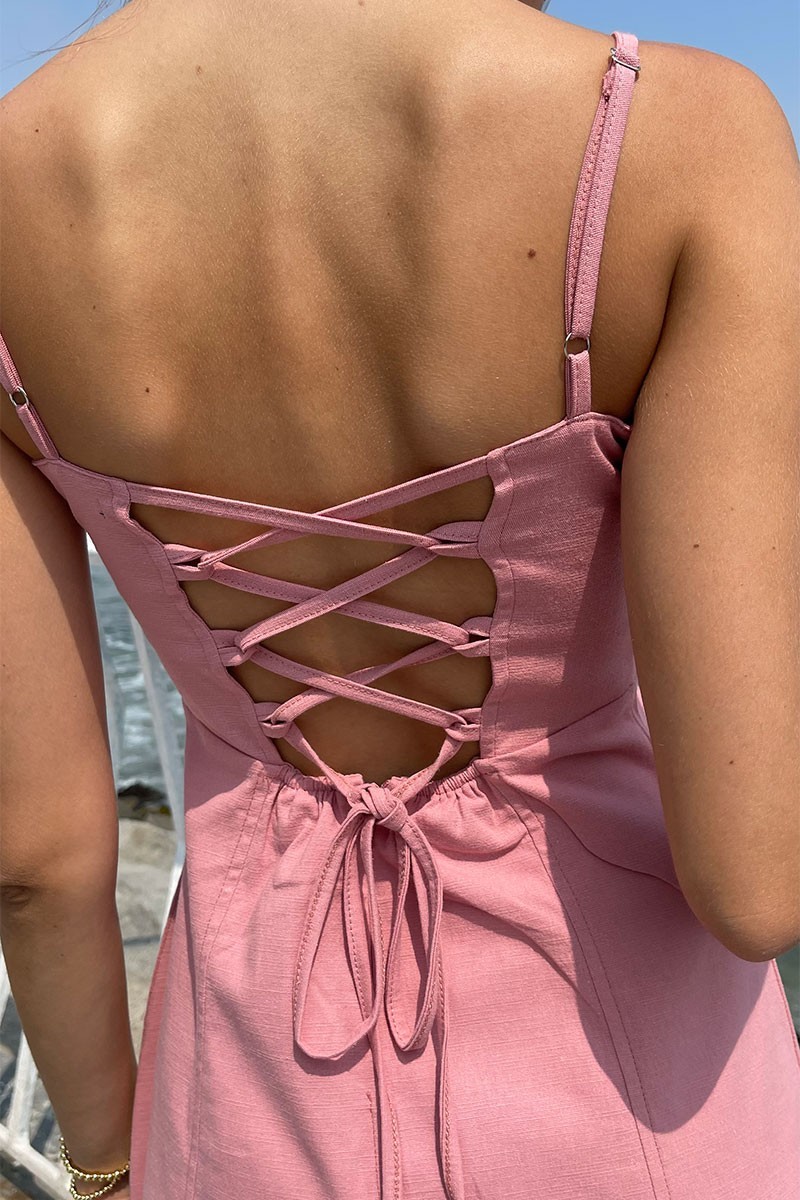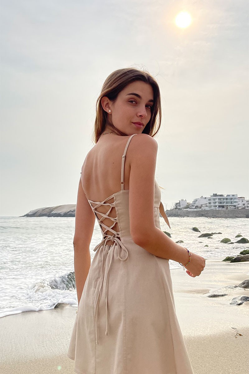 Este vestido presenta un diseño cuidadosamente elaborado con un toque distintivo: tiras regulables en la espalda que le agrega un elemento de romantico y te brinda una silueta personalizada.