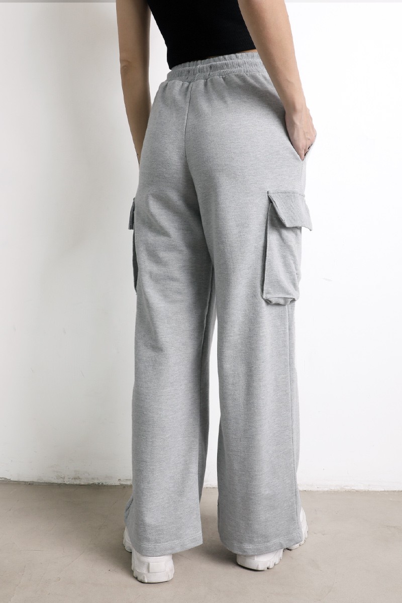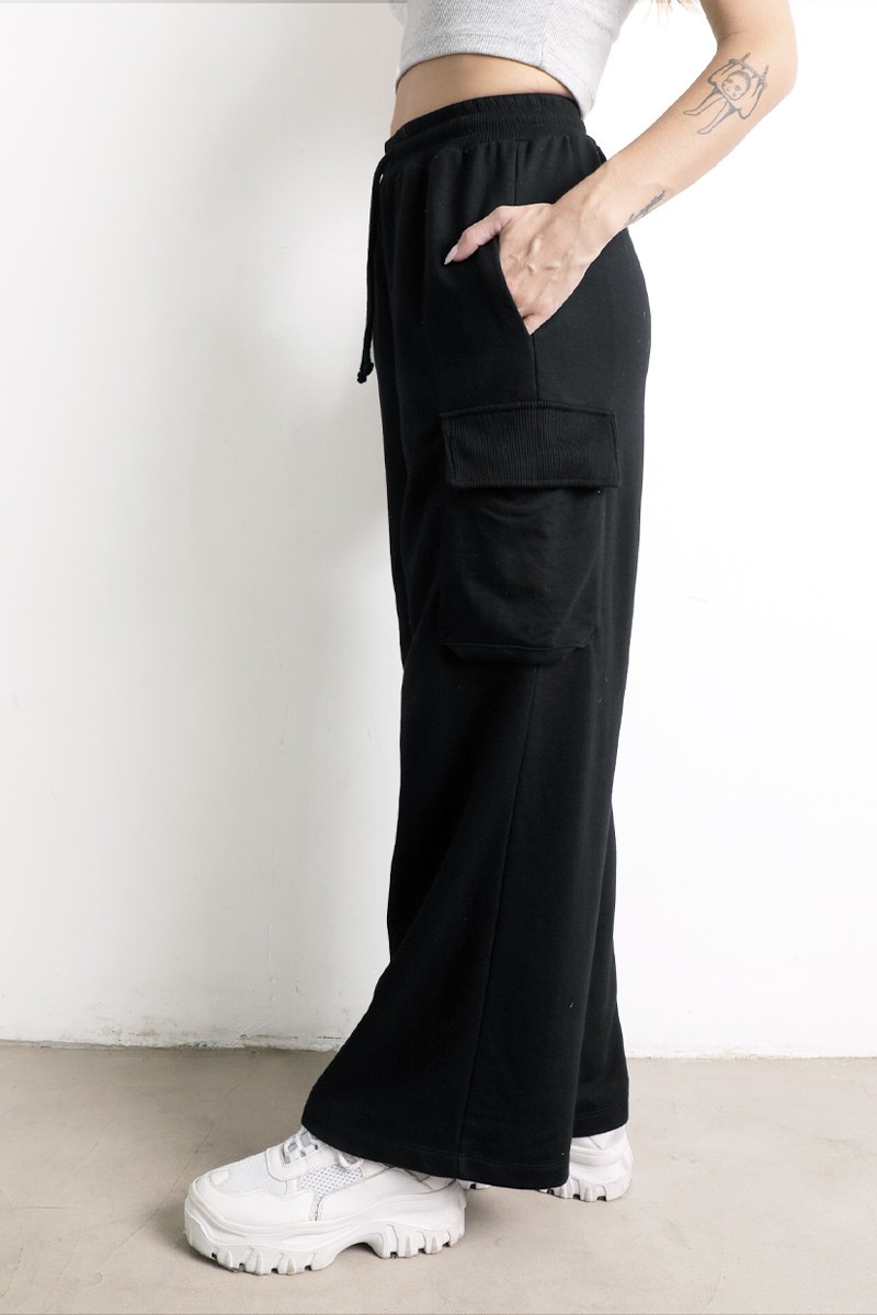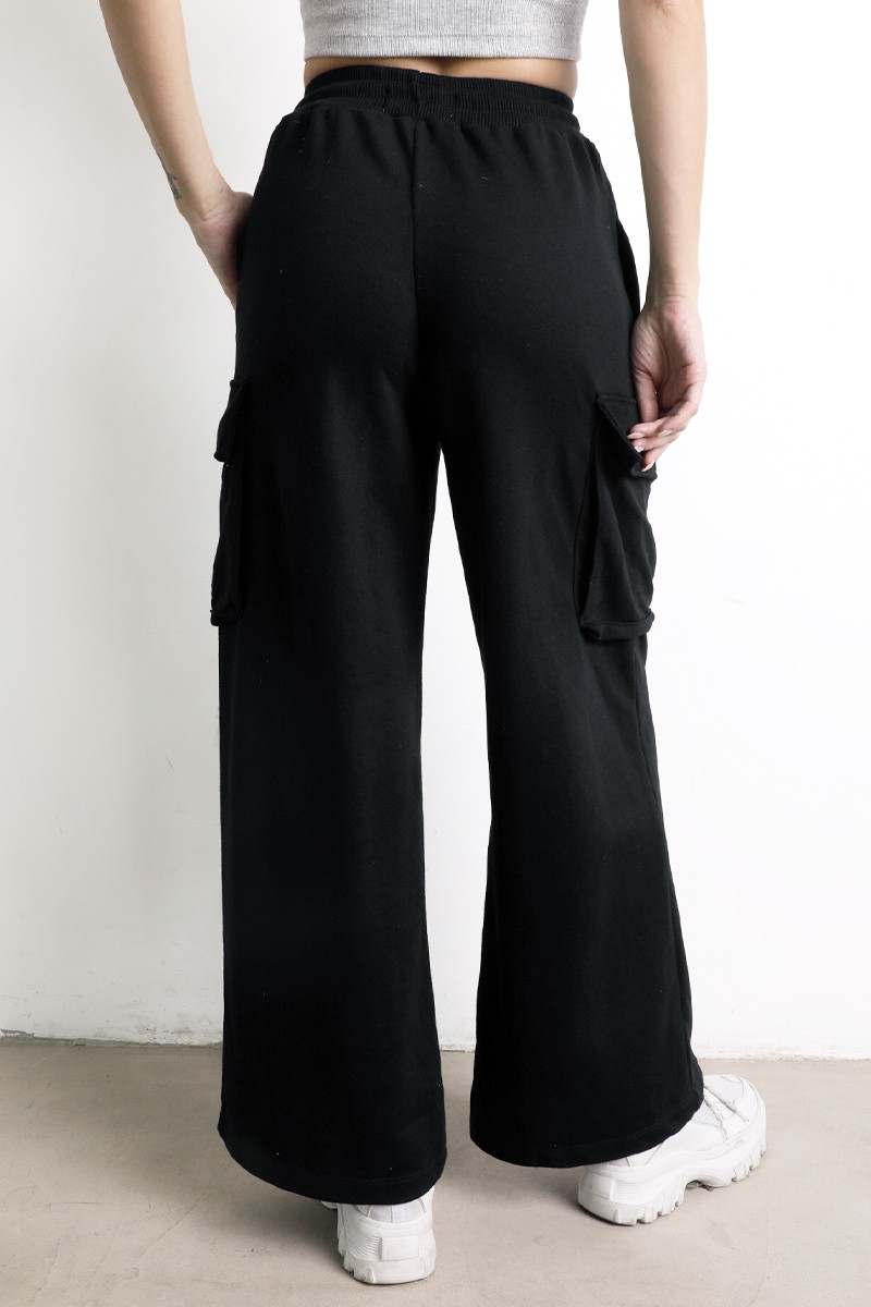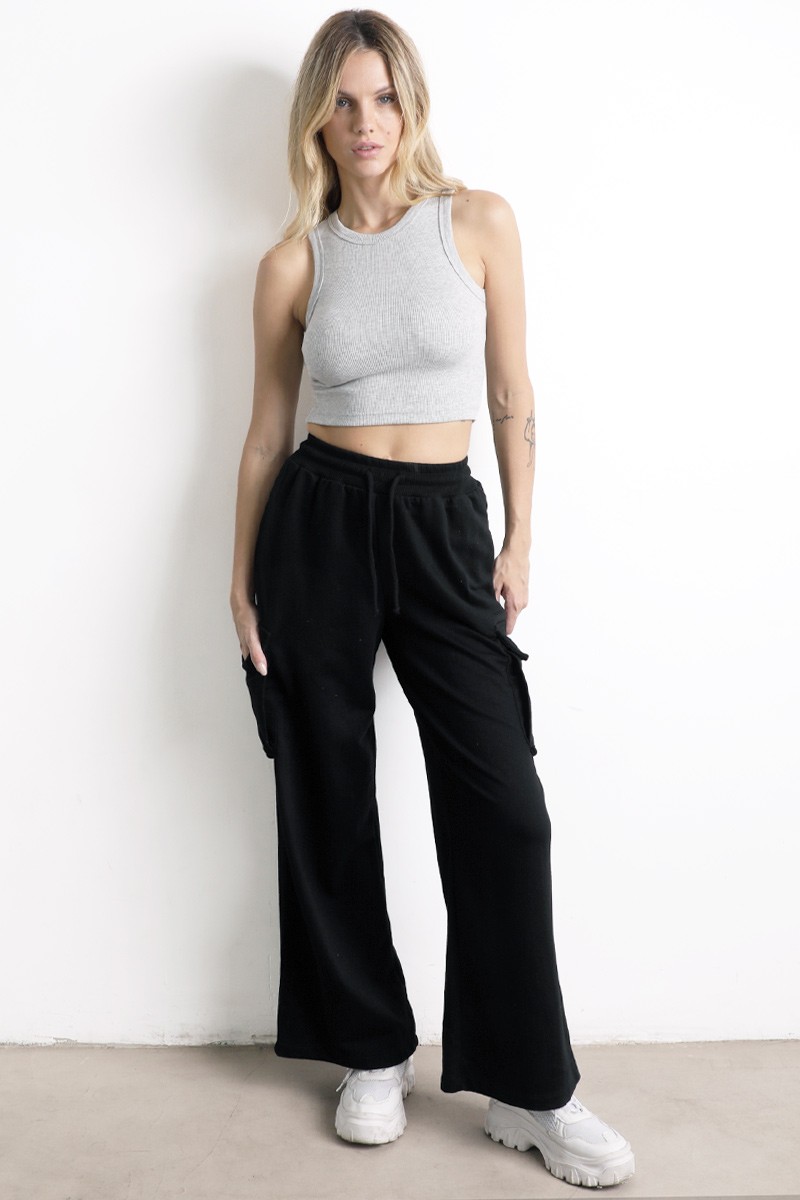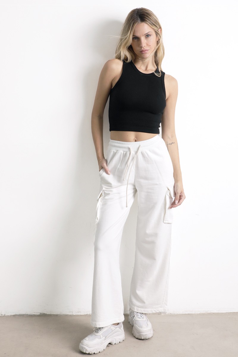 Pantalón Palazo cargo , con elástico, y tiras para ajustar en la cintura. Bolsillos a ambos lados.