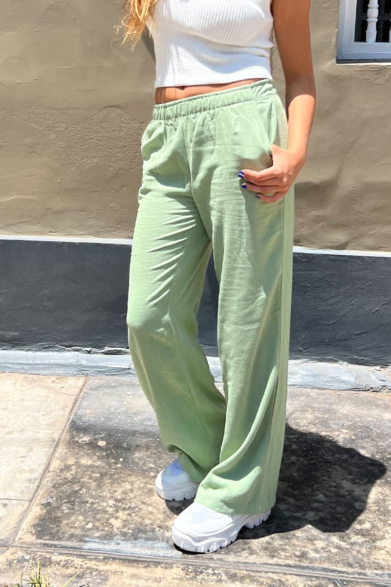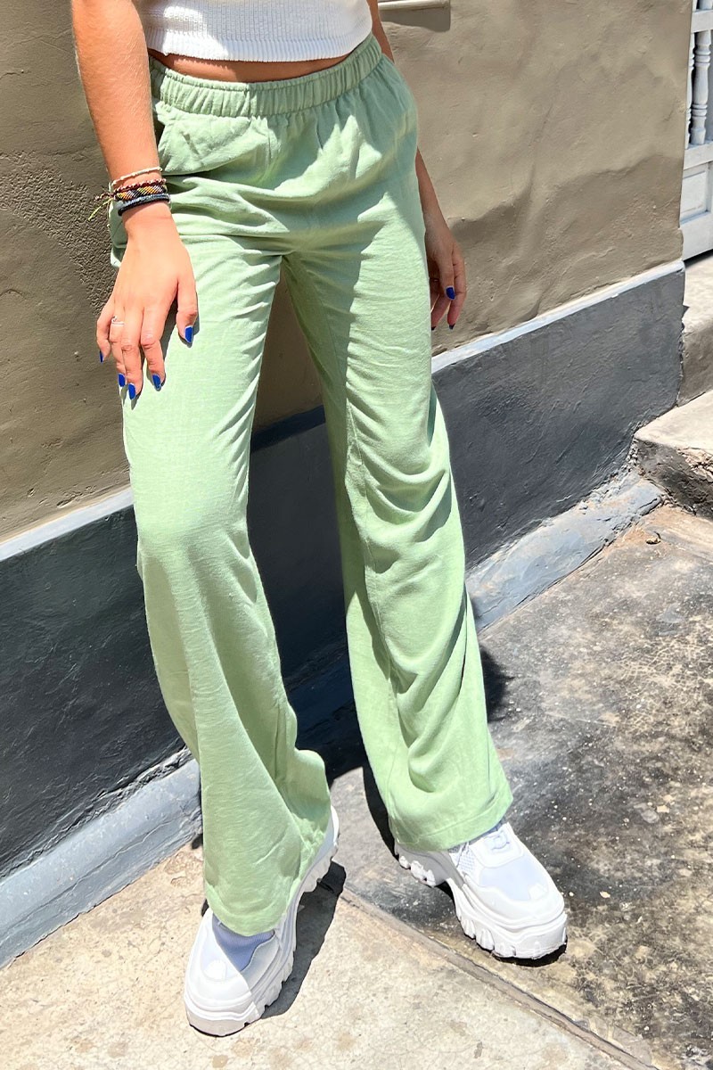 Pantalón Ajuste relajado Exclusivo DESIRE 55% Lino 45% Algodón Modelo usa talla S Material ligero Lleva bolsillos delanteros Cintura elástica No estirable