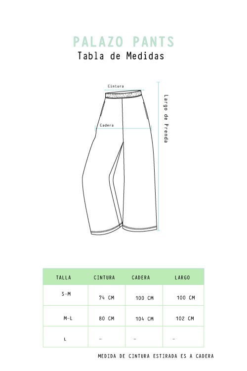 Pantalón Palazo con elástico Diseño y producción 100% peruana. La modelo mide 1.65 cm y usa talla S. COMPOSICIÓN 100% algodón CUIDADOS No use lejía No usar secadora