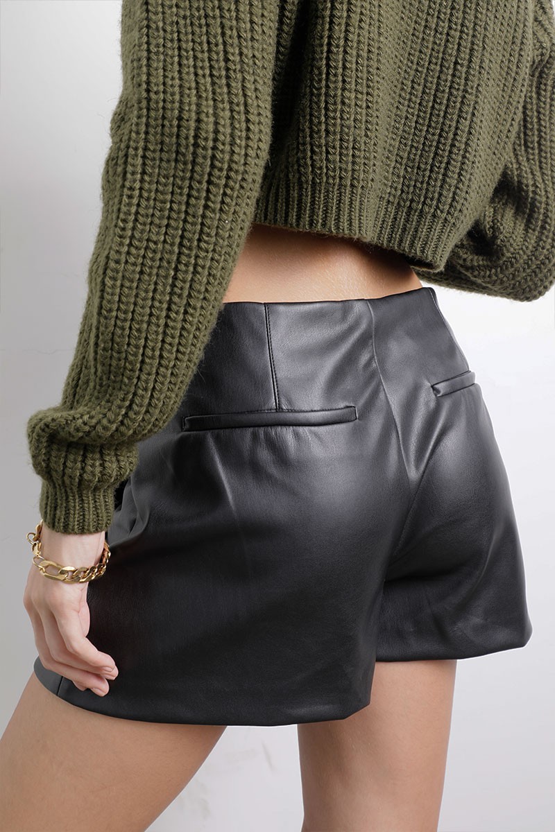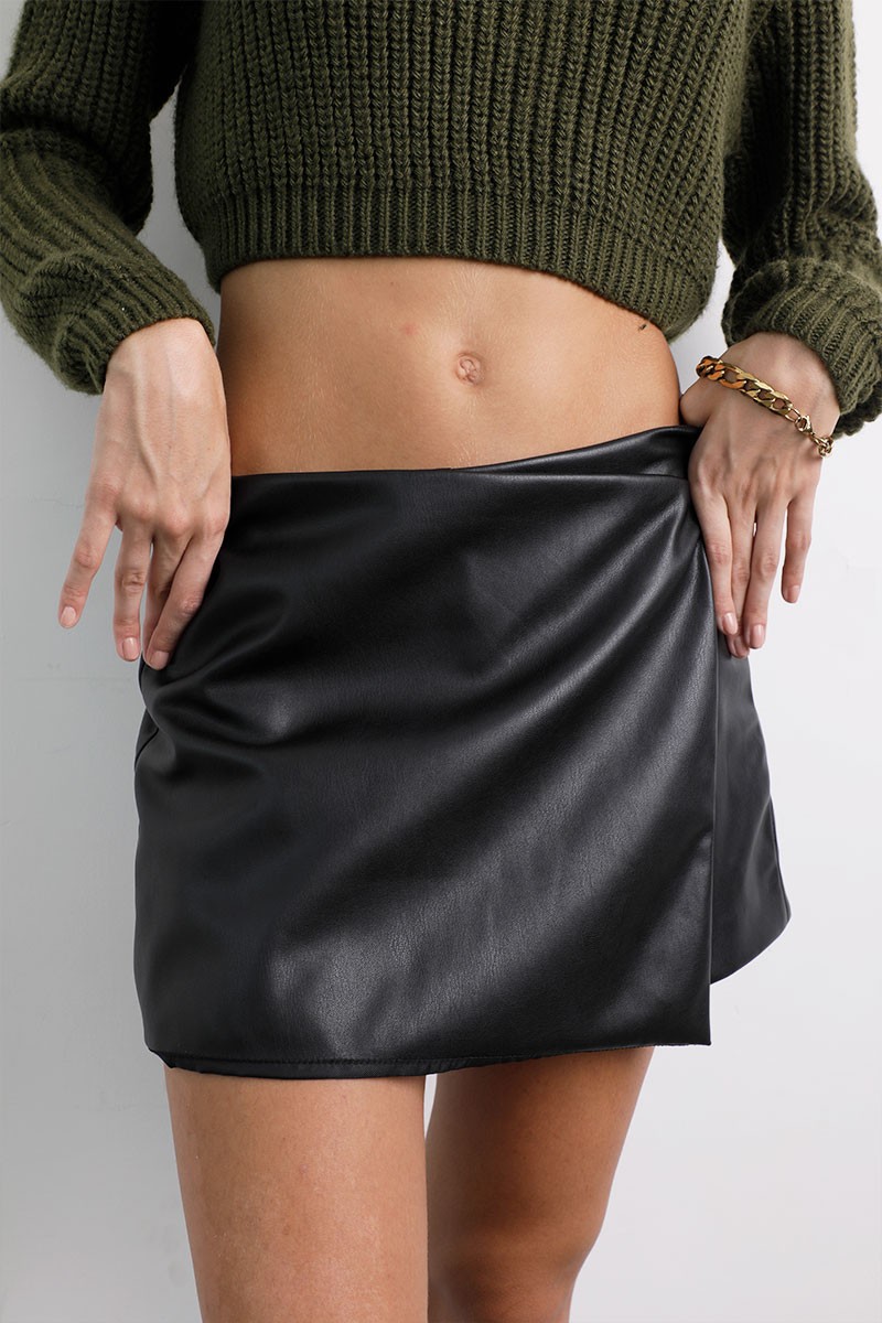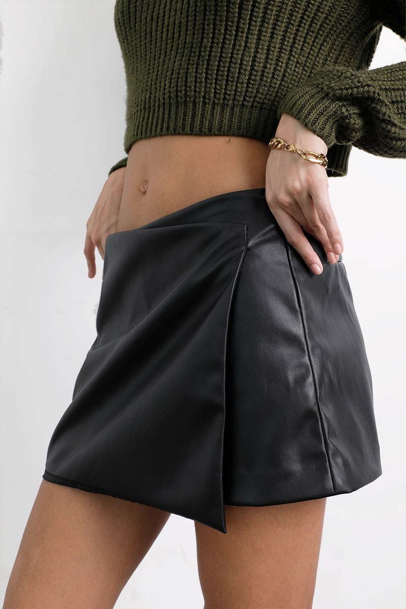 ¡La falda short cuerina es super versátil con los tops, la falda asimétrica le da el toque perfecto de movimiento y glamour.