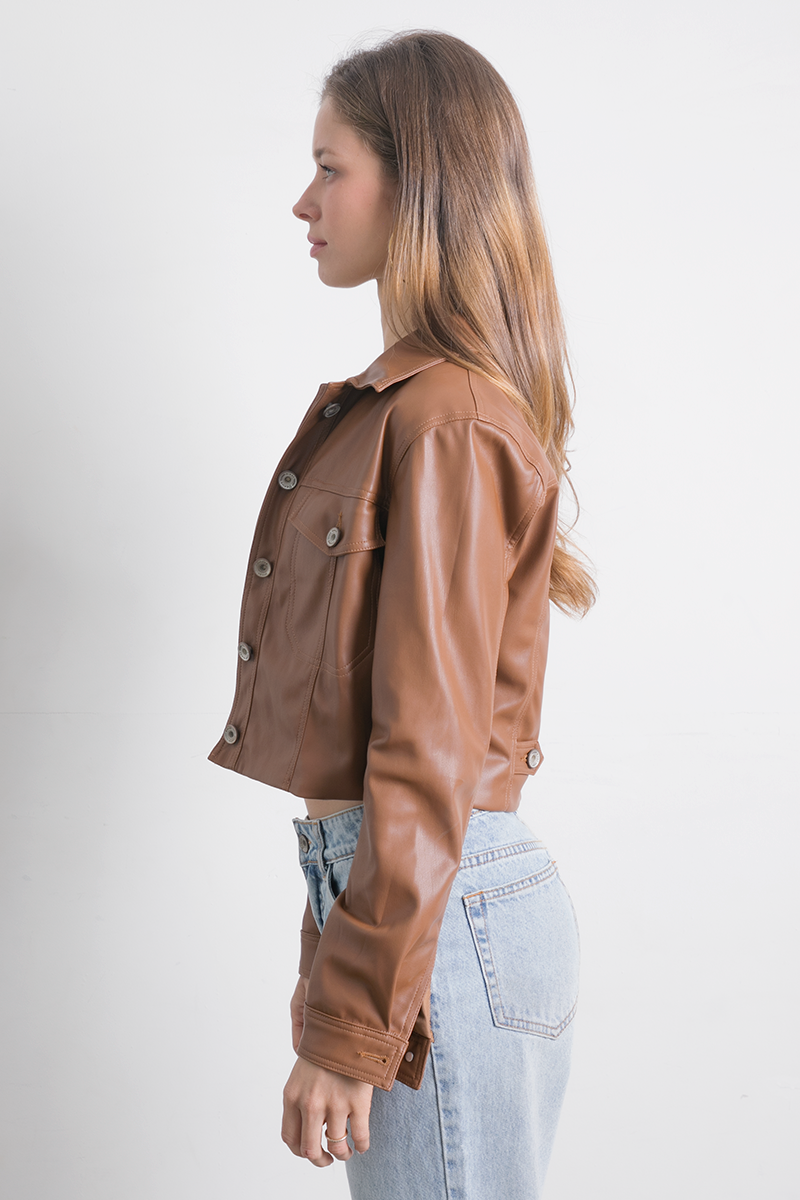 Chaqueta cuerina bolsillos delanteros, botones y mangas largas .
