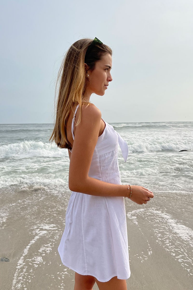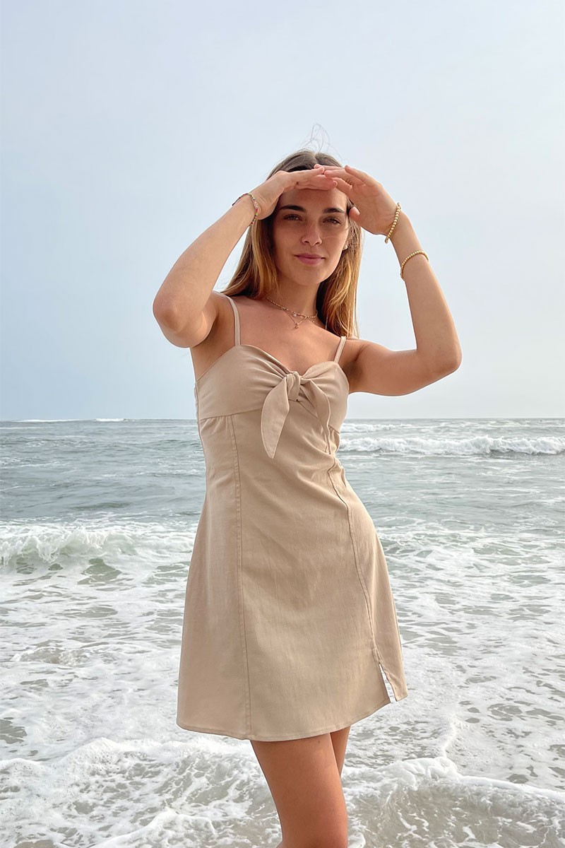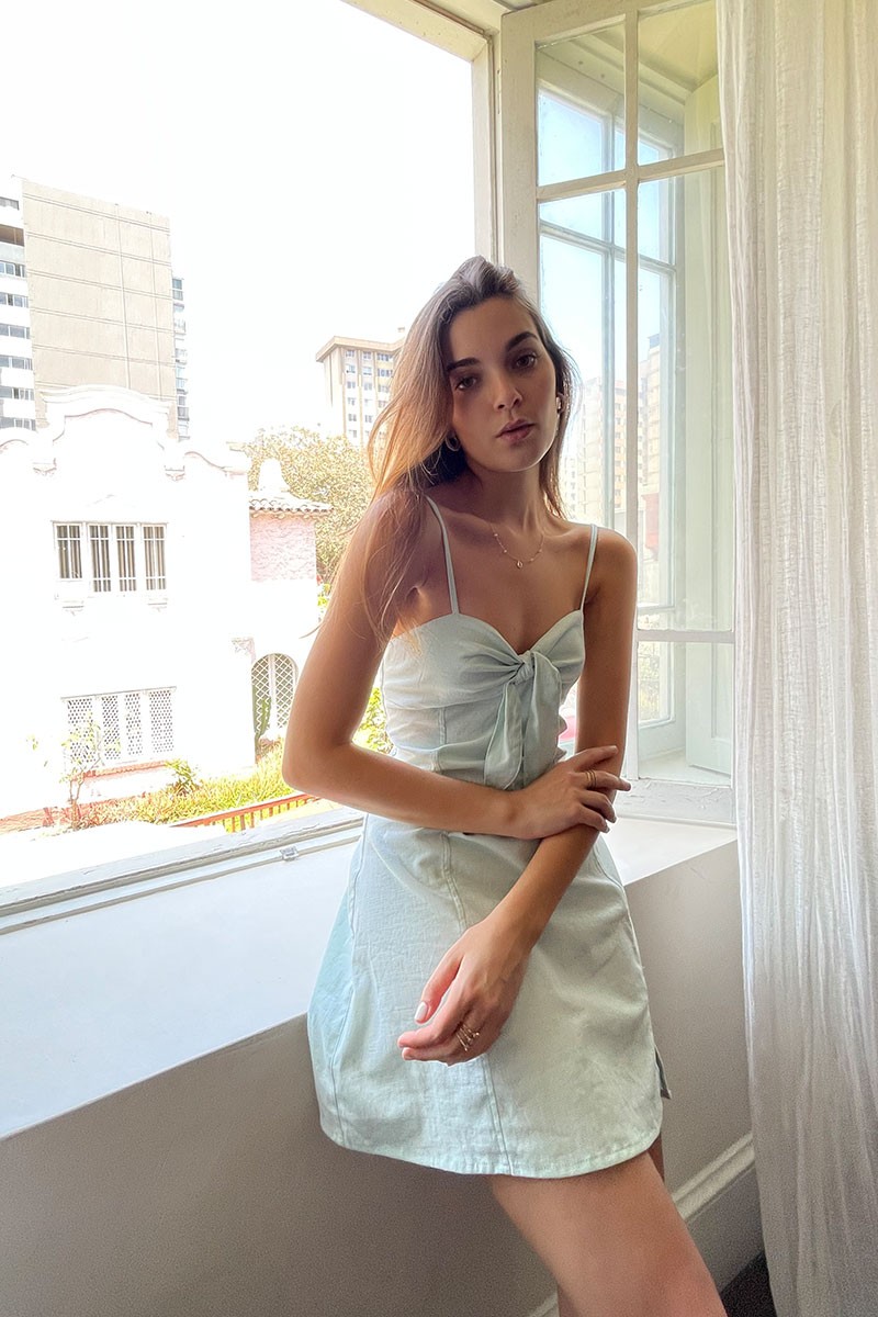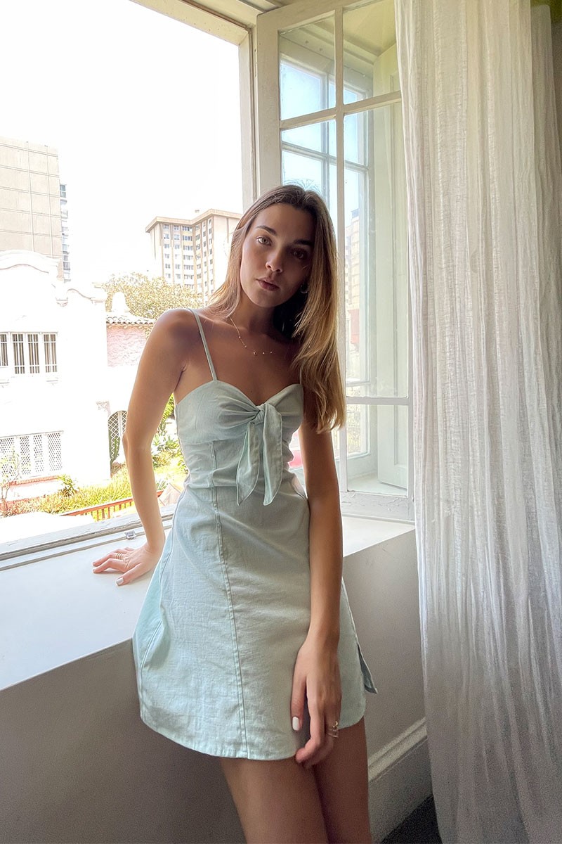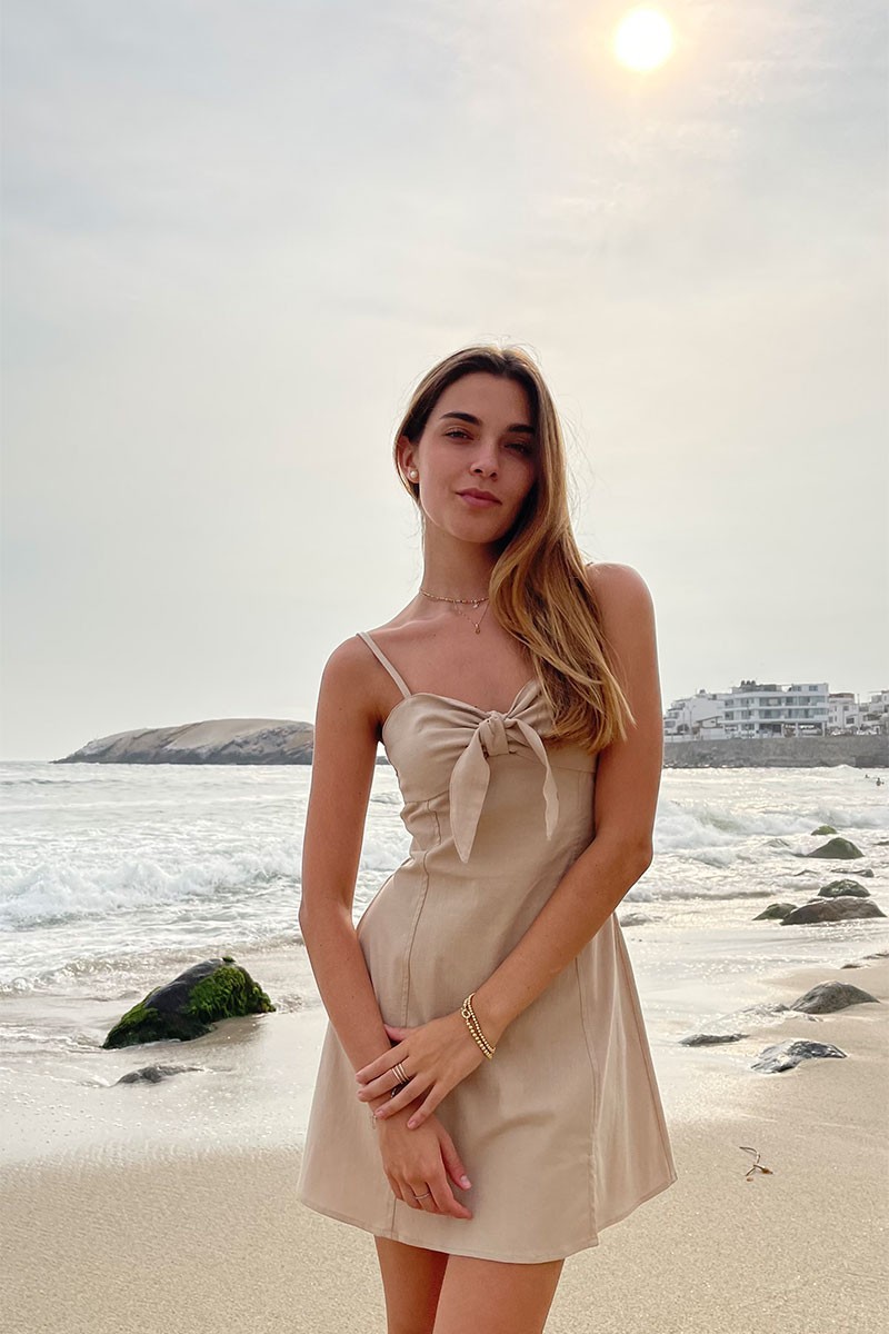 ¡Este vestido se volverá tu favorito! La espalda del vestido está diseñada con tiras ajustables que permiten regular el ajuste de la prenda a tu medida, brindando comodidad y una silueta personalizada. En la parte delantera, el vestido presenta un elegante moño frontal que agrega un toque de encanto y sofisticación al diseño . Diseño y producción 100% peruana. La modelo mide 1.73cm y usa talla S. Composición: 100% Algodón Cuidados: Lavado a mano No usar secadora Secado en sombra No usar lejia.