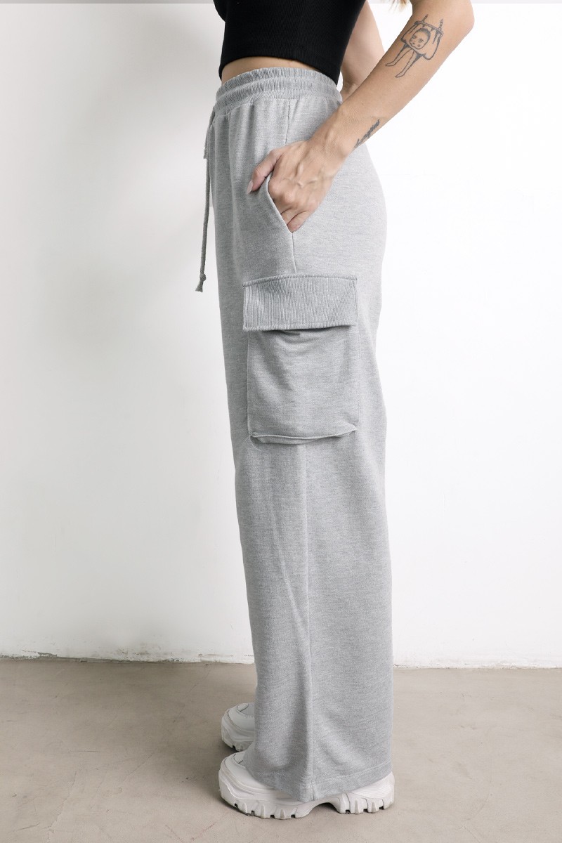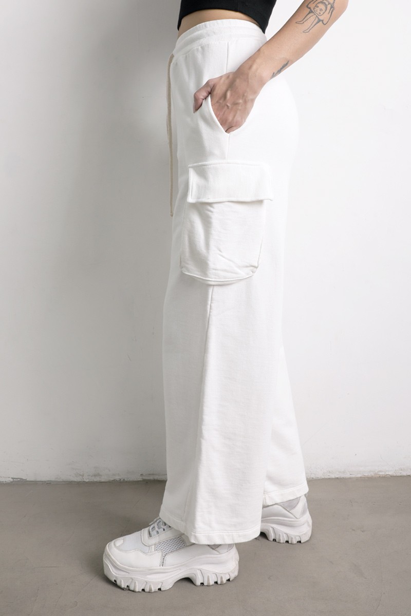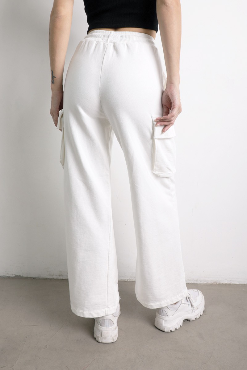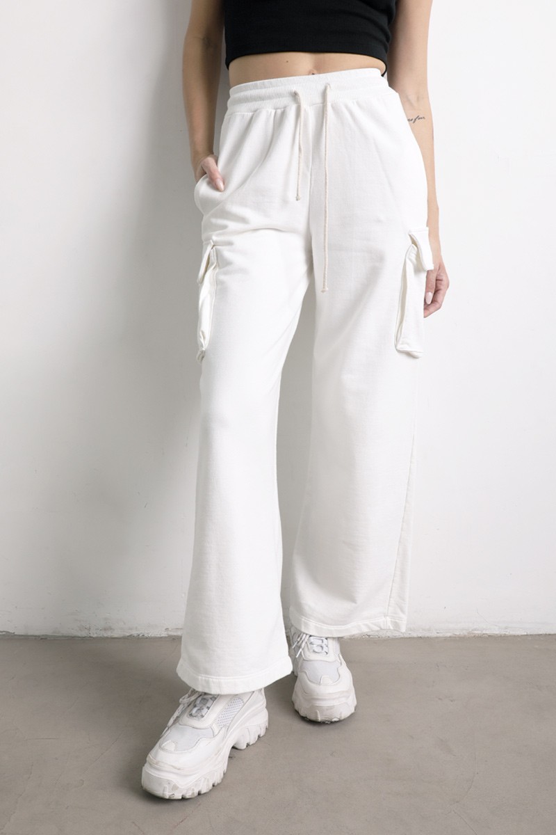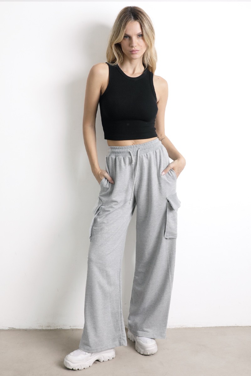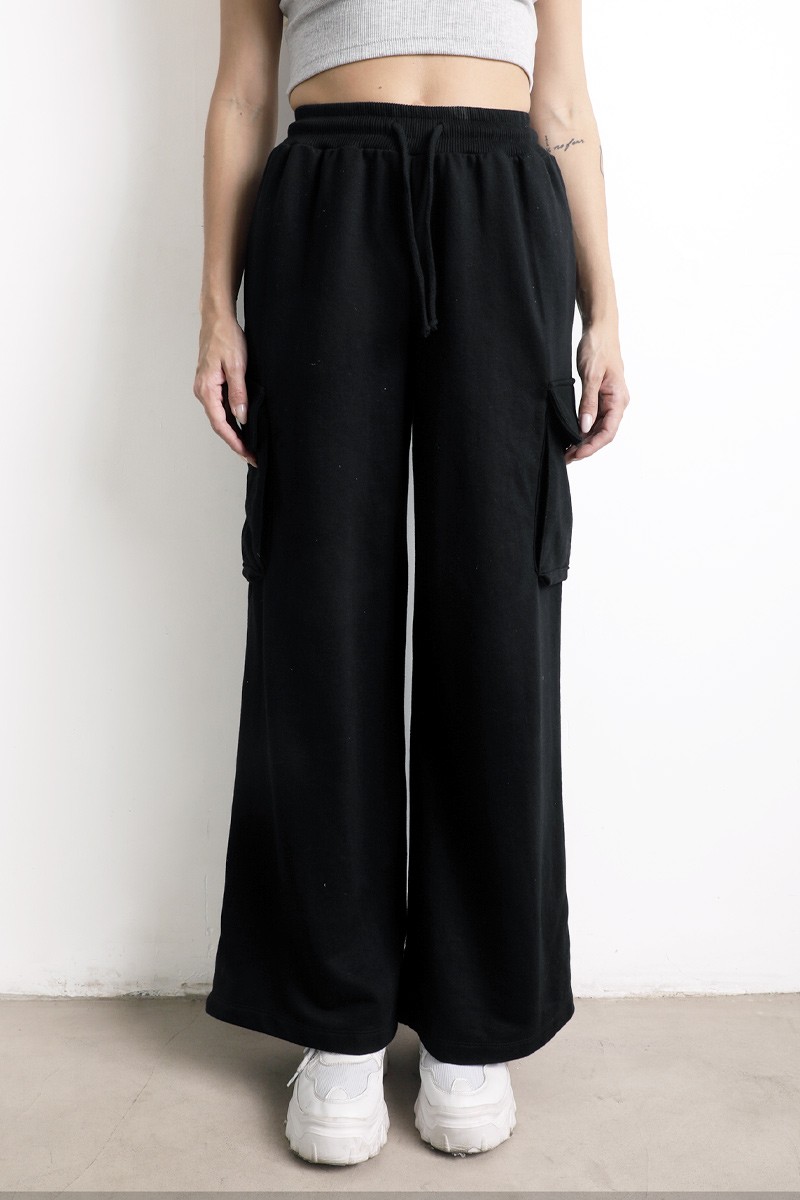 Pantalón Palazo cargo , con elástico, y tiras para ajustar en la cintura. Bolsillos a ambos lados.