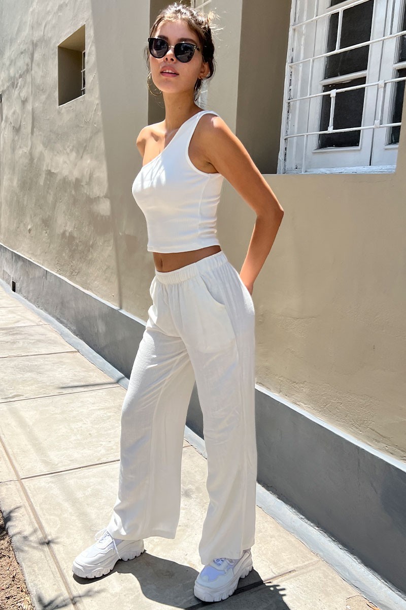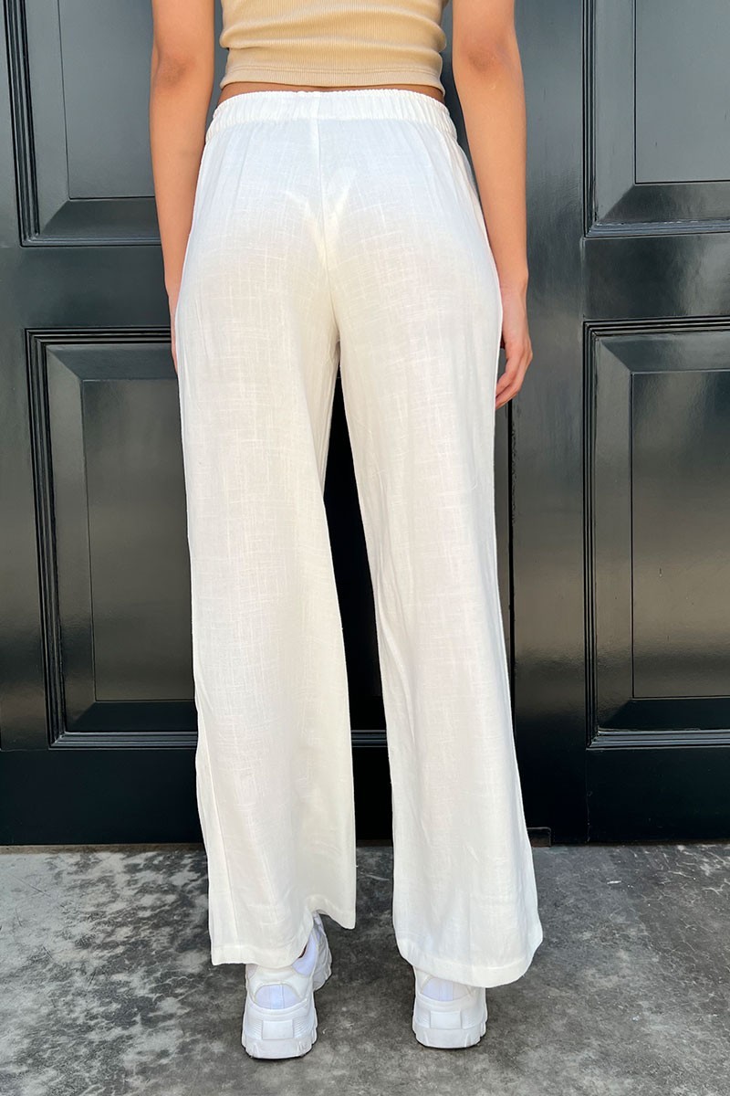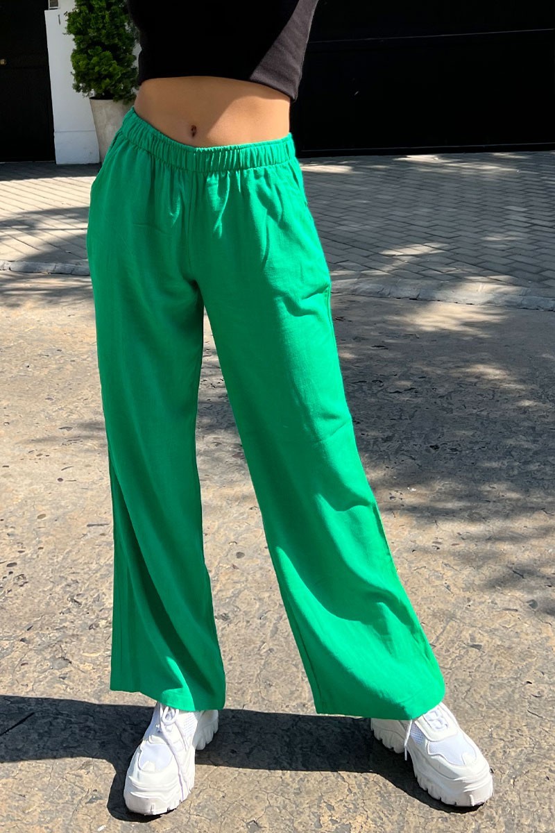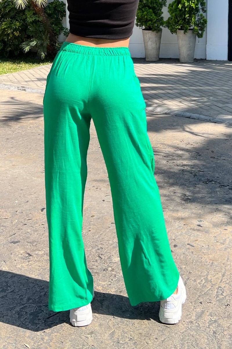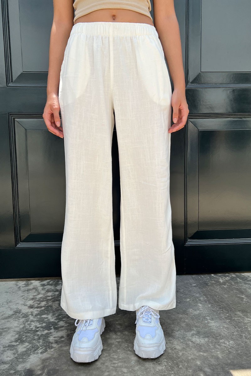Pantalón Ajuste relajado Exclusivo DESIRE 55% Lino 45% Algodón Modelo usa talla S Material ligero Lleva bolsillos delanteros Cintura elástica No estirable