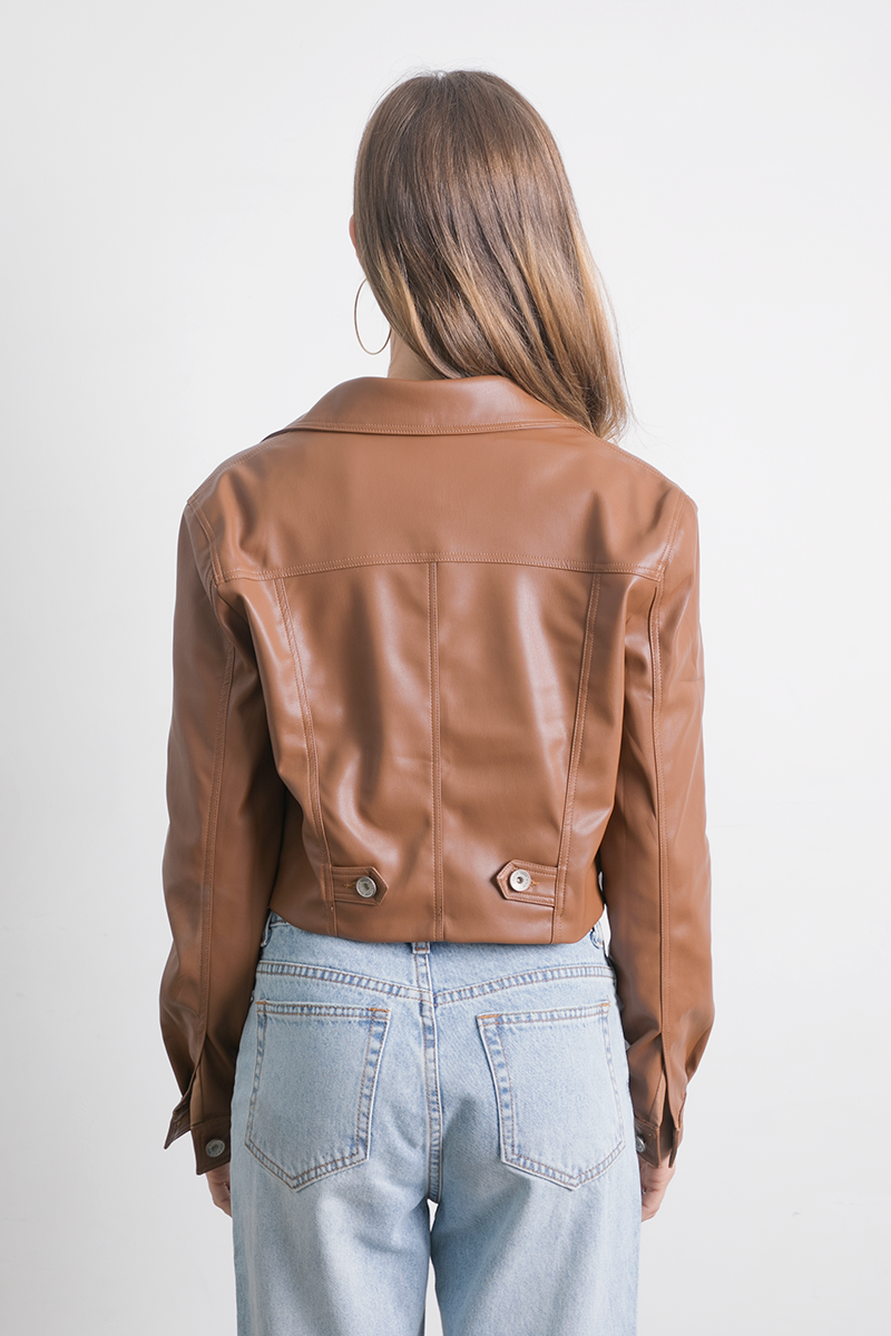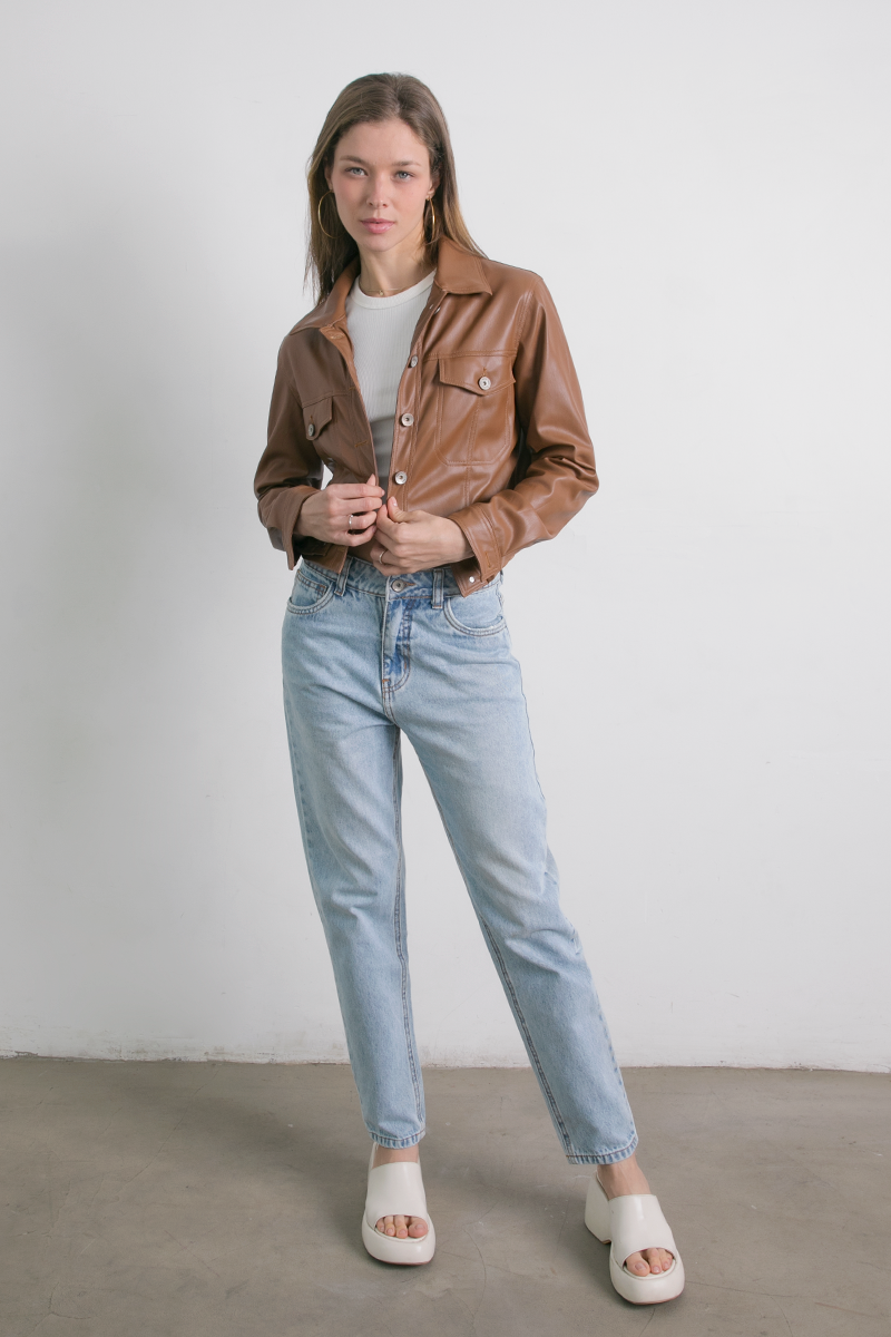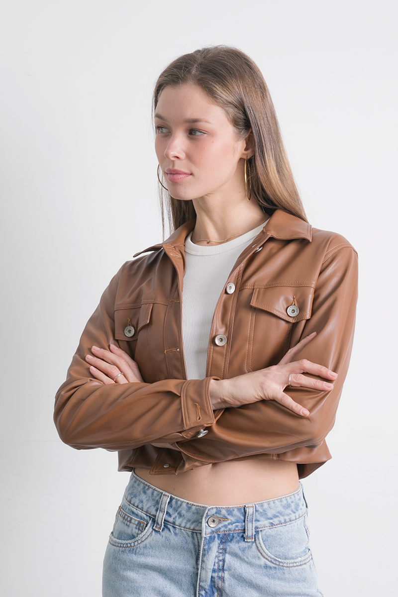 Chaqueta cuerina bolsillos delanteros, botones y mangas largas .